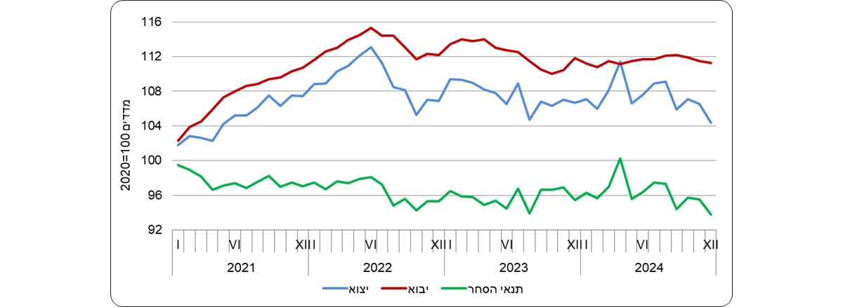 ניכר שיפור של 0.5% במדד תנאי הסחר (ללא אוניות, מטוסים, יהלומים וחומרי אנרגיה) בעקבות ירידה קטנה יותר במדד מחירי היצוא לעומת מדד מחירי היבוא בשנת 2024. מדד תנאי הסחר מוגדר כיחס בין השינוי במדדי המחירים של היצוא לבין מדדי המחירים של היבוא.