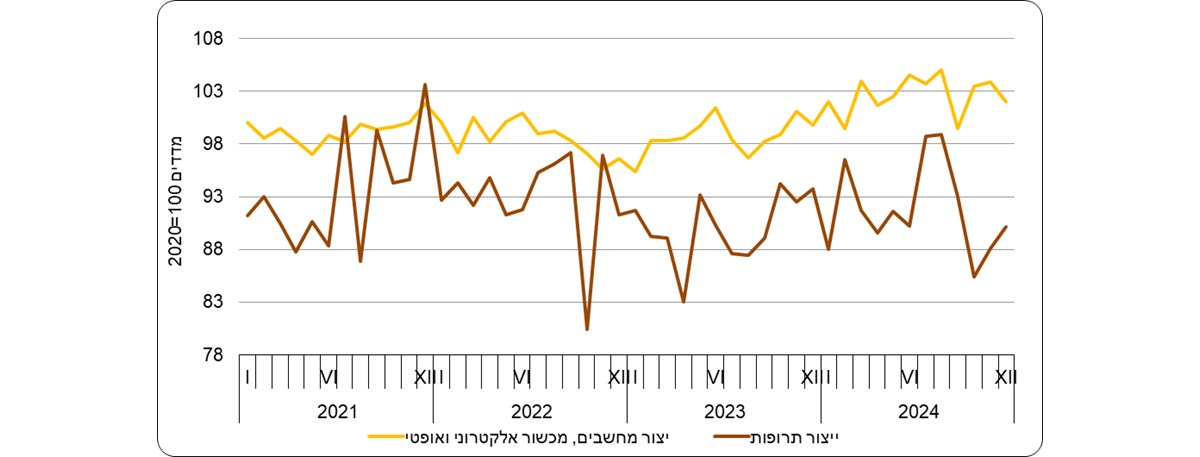 נתונים מפורטים לפי ענפי כלכלה מלמדים על עלייה במדד המחירים של ענף ייצור מחשבים, מכשור אלקטרוני ואופטי ב-4.1% בשנת 2024, בהמשך לעלייה של 0.3% בשנת 2023. מדד המחירים של יצוא ענף ייצור תרופות עלה ב-1.7% בשנת 2024, בהמשך לעלייה של 0.2% בשנת 2023, ומדד המחירים של יצוא ענף ייצור כלי טיס, חלליות וציוד נלווה, עלה ב-0.6% בשנת 2024, בהמשך לעלייה של 4.1% בשנת 2023.