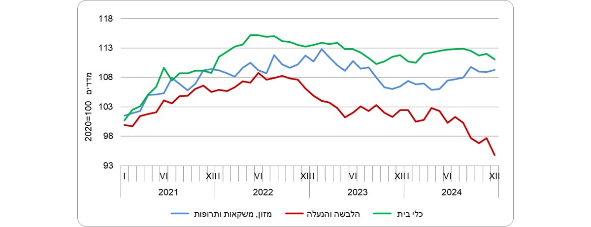 מדד המחירים של יבוא מוצרי צריכה ירד בשנת 2024 ב-0.6% לאחר עלייה של 0.1% בשנת 2023. מדד המחירים של יבוא מוצרים לצריכה שוטפת (מזון, הלבשה, הנעלה ומוצרים להחזקת משקי בית) ירד בשנת 2024 ב-1.7%, בהמשך לירידה של 1.0% בשנה הקודמת. עיקר הירידה נרשמה במדד המחירים של יבוא הלבשה והנעלה - 3.3%.