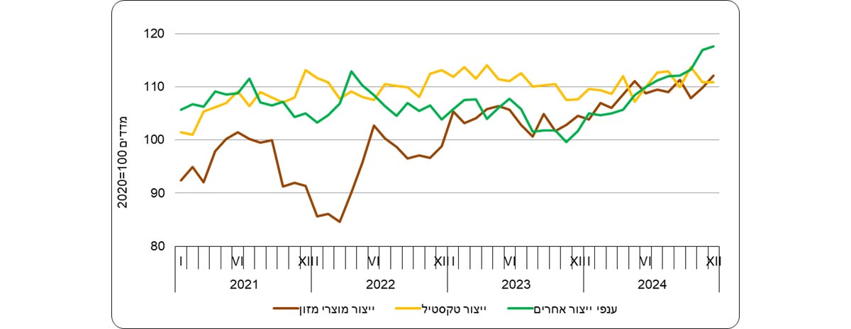 מדד המחירים של יצוא תעשיות טכנולוגיה מסורתית עלה בשנת 2024 ב-2.9%, בהמשך לעלייה של 4.3% בשנת 2023. נתונים מפורטים לפי ענפי כלכלה מלמדים על עלייה של 4.7% במדד המחירים של יצוא ענף ייצור מוצרי מזון בשנת 2024. יצוא תעשיות טכנולוגיה מסורתית הוא כ-7% מהיצוא התעשייתי (ללא יהלומים).
