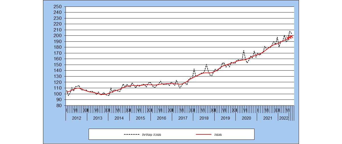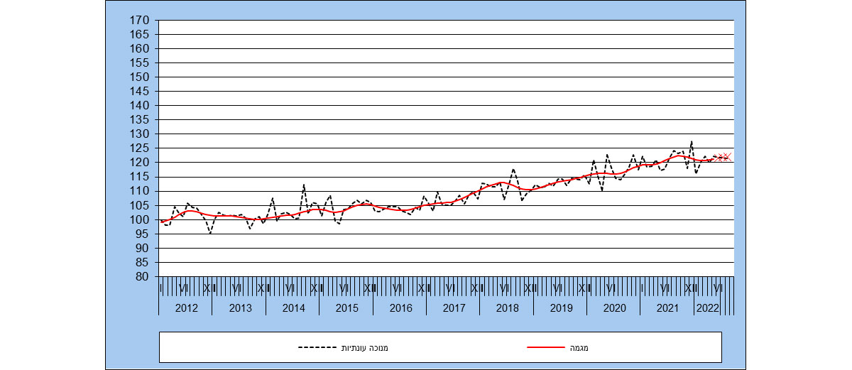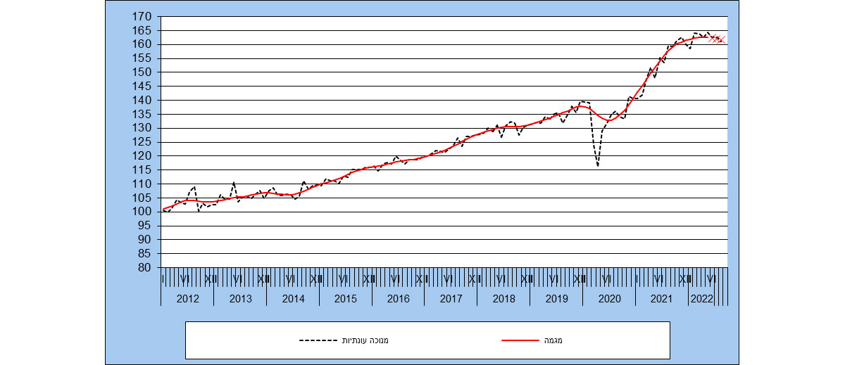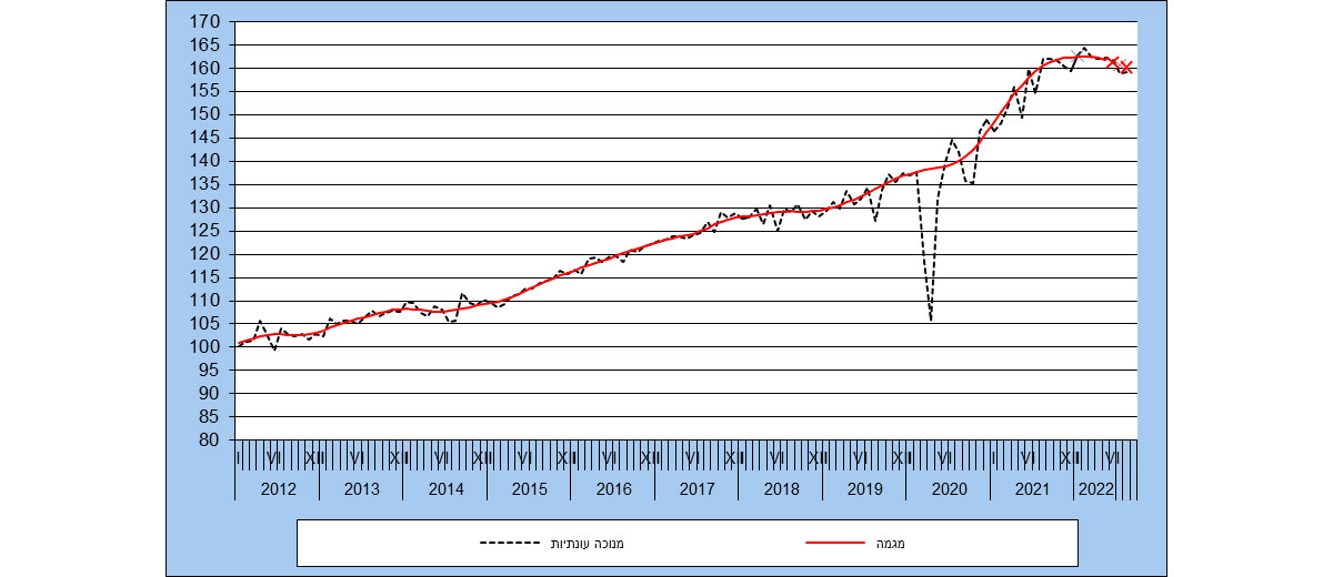 בסדרות אלו, ממרס 2020, עקב משבר הקורונה, התקבלו נתונים חריגים, שינויים פתאומיים ומתמשכים ברמת הנתונים המקוריים, דהיינו שינוי ברמת הסדרה. לכן אמידת סדרה מנוכת עונתיות ומגמה שלאחר מרס 2020 התקיימה לאחר התאמת נתוני הסדרה עד פברואר 2020, לרמות הנמוכות שהתקבלו בחודשים הראשונים של המשבר.