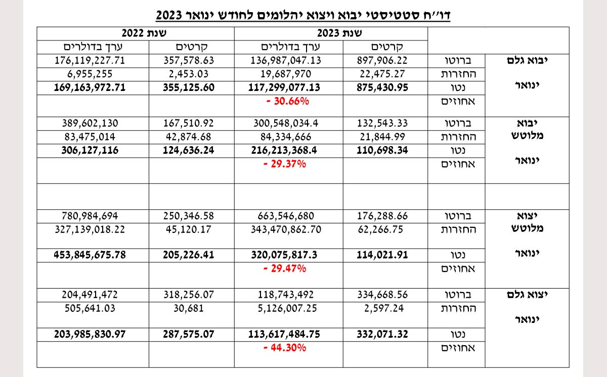 בחודש ינואר השנה היה היבוא נטו של יהלומי גלם לישראל כ-117 מיליוני דולרים - ירידה של כ-31% לעומת חודש ינואר אשתקד. יצוא נטו של יהלומי גלם בחודש זה היה כ-114 מיליוני דולרים - ירידה של כ-44% לעומת החודש הראשון של שנת 2022.