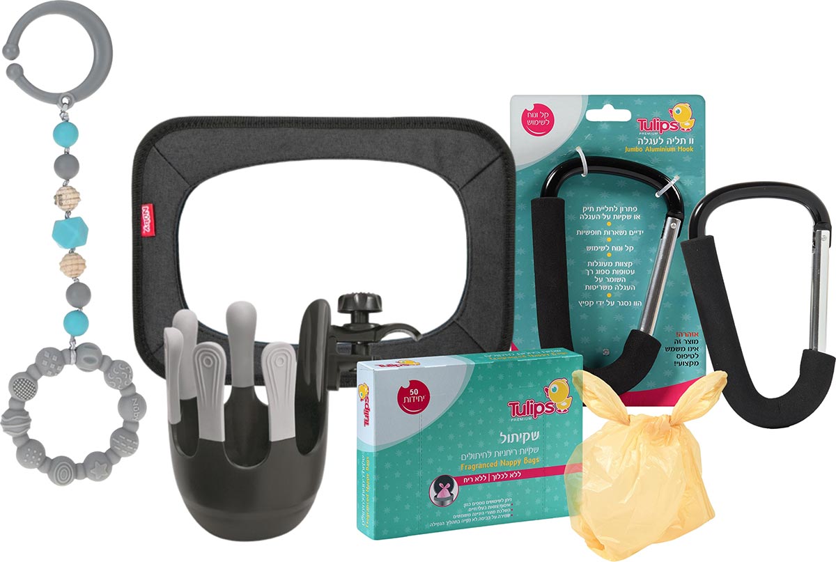 מדובר בבאנדל משתלם הכולל מוצרים של שני המותגים האהובים, עם כ־10% הנחה לעומת רכישת כל פריט בנפרד. בין הפריטים בחבילה: נשכן סיליקון עם שרשרת וטבעת לעגלה (במבחר צבעים), שניתן לתלות בקלות וכולל אזורי נשיכה בטקסטורות מגוונות; שאקל אלומיניום חזק לעגלה, לתליית תיקים או שקיות בצורה נוחה; מחזיק כוס אוניברסלי שמתאים לרוב הכוסות והבקבוקים, ומאפשר להורה להחזיק שתייה בצורה מאובטחת, ולפנות את הידיים כשצריך; מראת רכב בטיחותית עם רצועות מתכווננות, לצפייה בתינוק הנוסע נגד כיוון הנסיעה; וחבילת 50 שקיות ריחניות, עמידות וחזקות, לאחסון היגייני של טיטולים בשימוש.