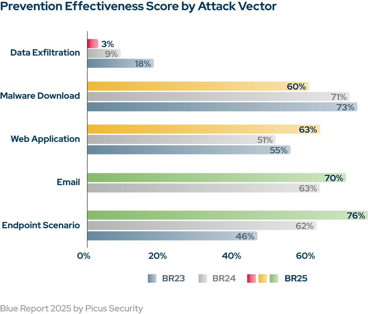 הדו"ח הכחול (Blue Report) לשנת 2025 חושף גם כי יעילות המניעה ירדה מ-69% ב-2024 ל-62% ב-2025, והפכה את ההישגים של השנה שעברה. ובעוד שכיסוי הרישום נשאר יציב על 54%, רק 14% מההתקפות יצרו התראות, כלומר רוב הפעילות הזדונית עדיין נעלמת מעינינו. כשלים בתצורת כללי האיתור, פערי רישום ושילוב מערכות ממשיכים לערער את הניראות בפעולות האבטחה. הירידה מדגישה כמה מהר הגנות יכולות להידרדר ללא פיקוח מתמשך ואימות של בקרות אבטחה.