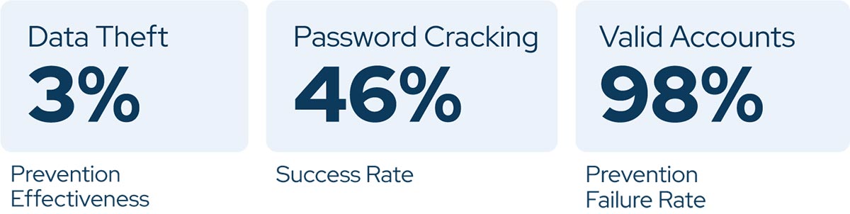 בעוד שהגידול של מתקפות הסייבר הוא בכמות והן בתחכום, יעילות ההגנה יורדת. הנתונים של השנה מציירים תמונה קודרת במיוחד: ב-46% מהסביבות, לפחות גיבוב סיסמה אחד נפרץ בהצלחה, וניסיונות הוצאת נתונים מהארגון נעצרו רק ב-3% מהמקרים, ירידה מ-9% ב-2024. שילוב המגמות הללו מראה באיזו מהירות אישור יחיד שהפרץ יכול לפתוח את הדלת לתזוזה רוחבית ולגניבת נתונים בקנה מידה גדול. בעת ששכיחות הרושעות שמטרתן לגנוב מידע גדלה פי שלושה, והמציאות בה תוקפים עוקפים יותר ויותר הגנות באמצעות כניסות תקפות, ארגונים מתמודדים עם סיכון הולך וגובר מאיומים מתמשכים וכמעט בלתי נראים.