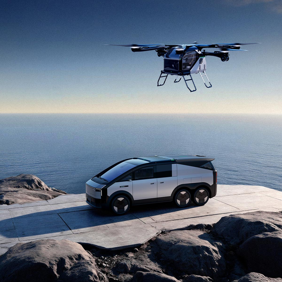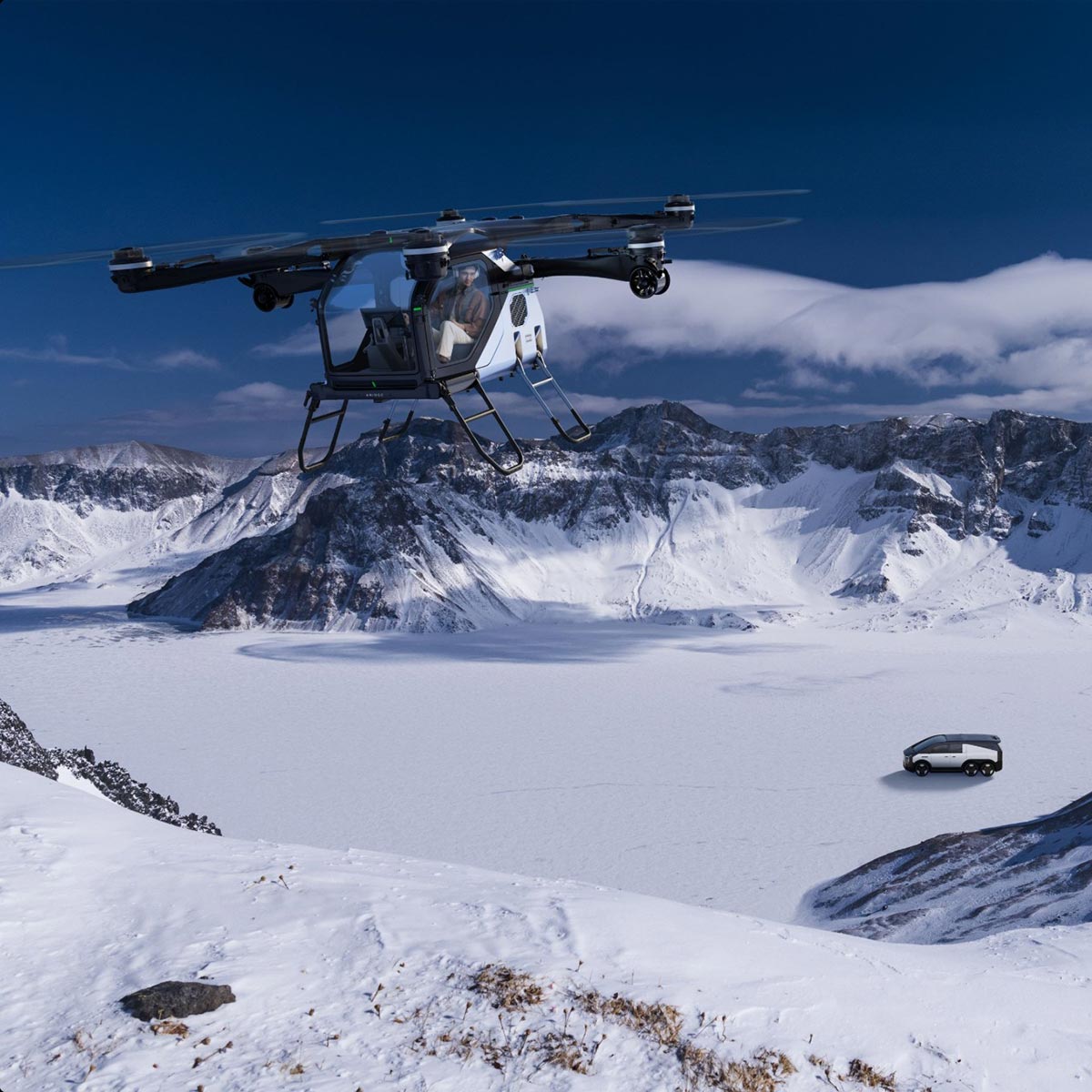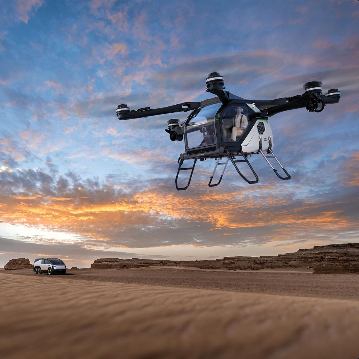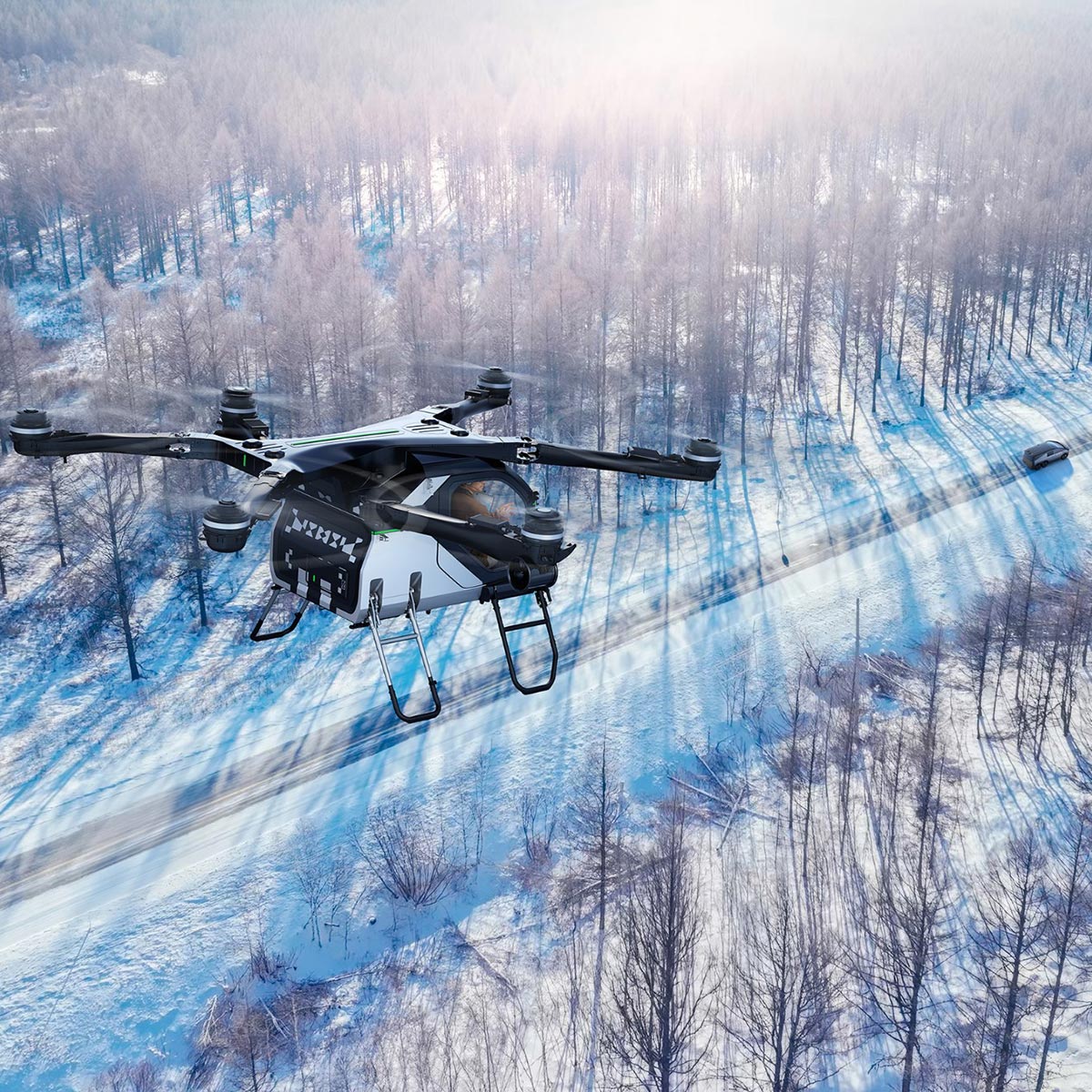 החלק האווירי הוא כלי טיס חשמלי בעל שישה רוטורים, גוף קל עשוי סיבי פחמן ומערך רוטורים כפולים. העיצוב נועד להפחית את משקל המבנה, לשפר את יעילות האנרגיה ולמזער רעידות ורעש בזמן טיסה. כלי הטיס יכול לפעול הן במצב טיסה ידני והן במצב אוטונומי מלא, עם מערכות בקרת טיסה חכמות המשלבות ניווט מבוסס בינה מלאכותית.
