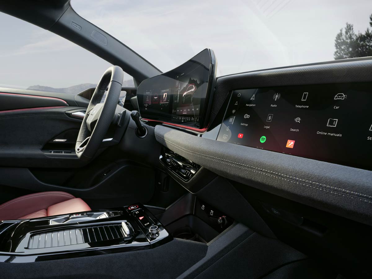 תצוגות המראות החיצוניות הווירטואליות (האופציונליות) ממוקמות בתוך הדלתות ומוצגות בבירור. התצוגה הפנורמית Audi MMI Panoramic Display כוללת מסך קעור בטכנולוגיית OLED לצד מסך LED לנוסע הקדמי, ומספקת במה דיגיטלית ברורה ונגישה הן לנהג והן לנוסע. המסך הפנורמי הדק בטכנולוגיית OLED כולל את Audi virtual cockpit Plus עם מסך בגודל 11.9 אינץ' לצד מסך ה-MMI touch המרכזי בגודל 14.5 אינץ'. לנוסע הקדמי מותקן מסך LED בגודל 10.9 אינץ' המשתלב היטב בעיצוב הדשבורד.