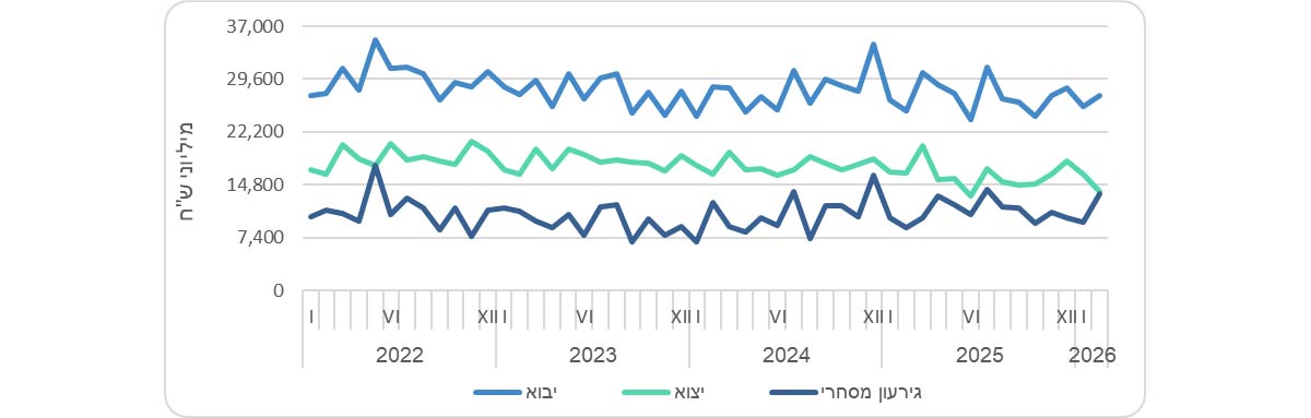 | מיליארדי ש"ח | פברואר 2026 | פברואר 2025 | ינואר עד פברואר 2026 | ינואר עד פברואר 2025 |
