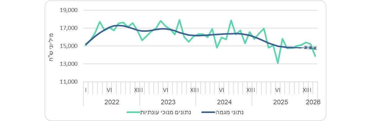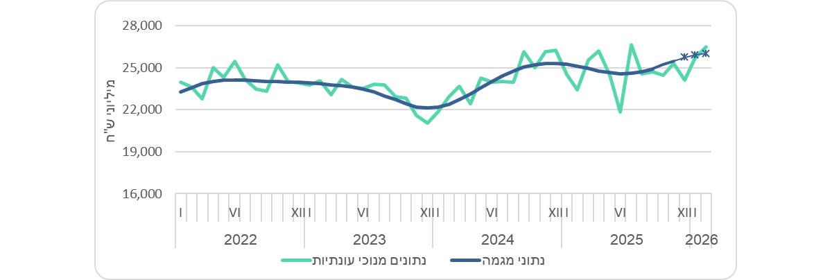 הערה: נתוני המגמה ומנוכי עונתיות מתקבלים לאחר ניכוי השפעת העונתיות והשפעת חגים וימי פעילות מהנתונים המקוריים. נתוני המגמה נאמדים לאחר הסרת השפעת האי סדירות (רעשים) מהנתונים מנוכי עונתיות. נתונים מנוכי עונתיות ונתוני מגמה המתפרסמים עשויים להתעדכן כאשר מתקבלים נתונים מקוריים חדשים.