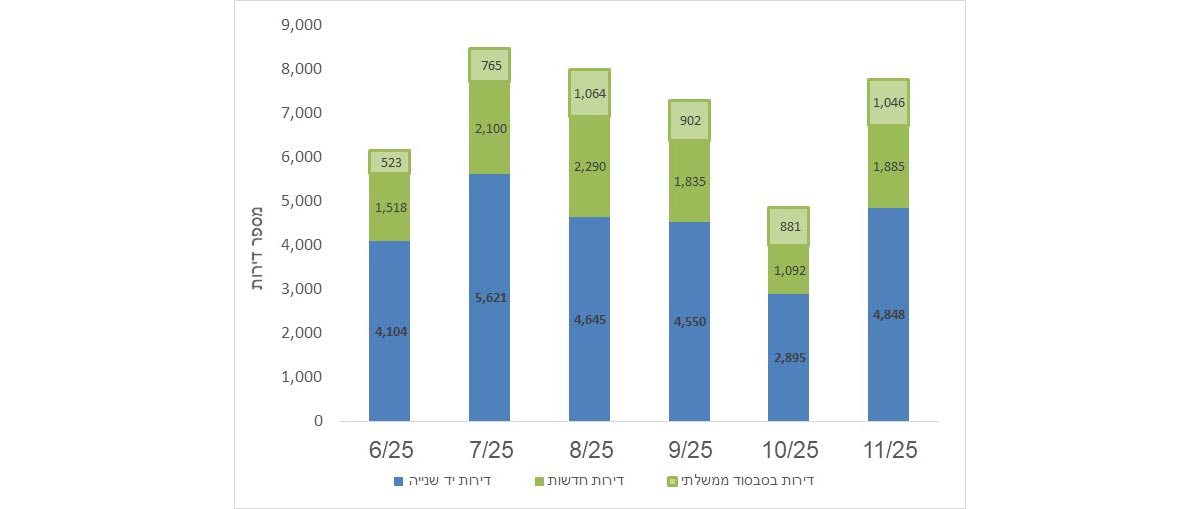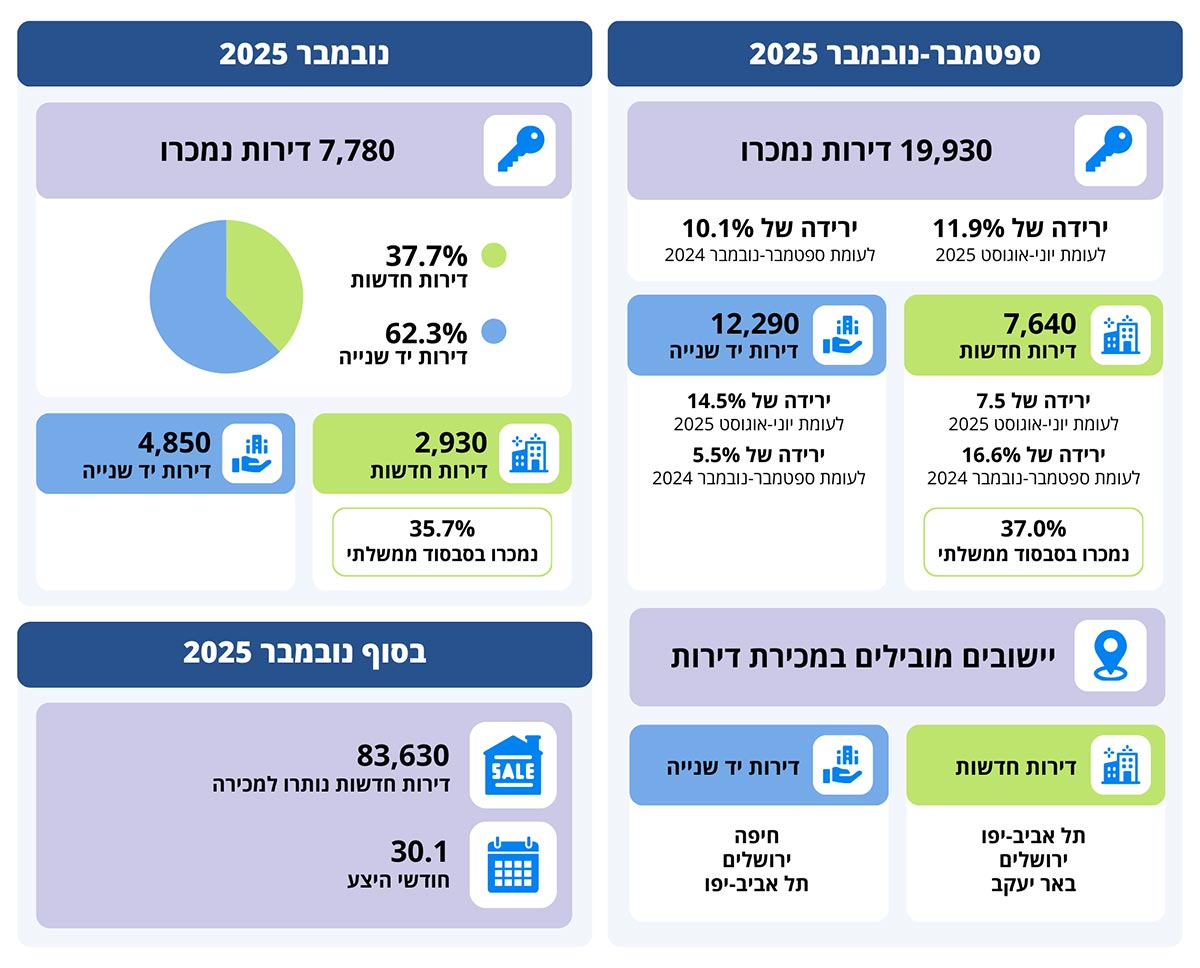 בחודש נובמבר 2025 נמכרו 7,780 דירות, מתוכן 37.7% דירות חדשות, כ־2,930 דירות. מתוך הדירות החדשות, כ־35.7% דירות נמכרו בסבסוד ממשלתי. 62.3% מהדירות שנמכרו הן מיד שנייה, כ־4,850 דירות.