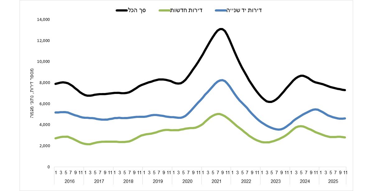 בשלושת החודשים מספטמבר עד נובמבר 2025 נמכרו כ־19,930 דירות, ירידה של 11.9% בהשוואה לשלושת החודשים הקודמים (יוני עד אוגוסט 2025). בניכוי עונתיות המגמה הפוכה: נצפתה עלייה בשיעור של 3.5%. בהשוואה לתקופה המקבילה אשתקד (ספטמבר עד נובמבר 2024) נצפו ירידות הן בנתון המקורי והן בניכוי עונתיות, 10.1% ו־6.5%, בהתאמה.