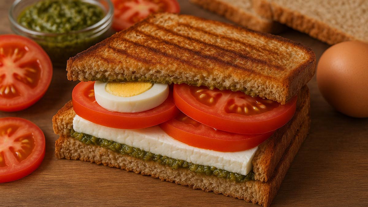 - מורחים את הפסטו על פרוסת לחם אחת. מניחים מעל גבינה, ביצה קשה ופרוסות עגבנייה, וסוגרים עם הפרוסה השנייה. מכניסים לטוסטר עד ששני הצדדים של הלחם מזהיבים.