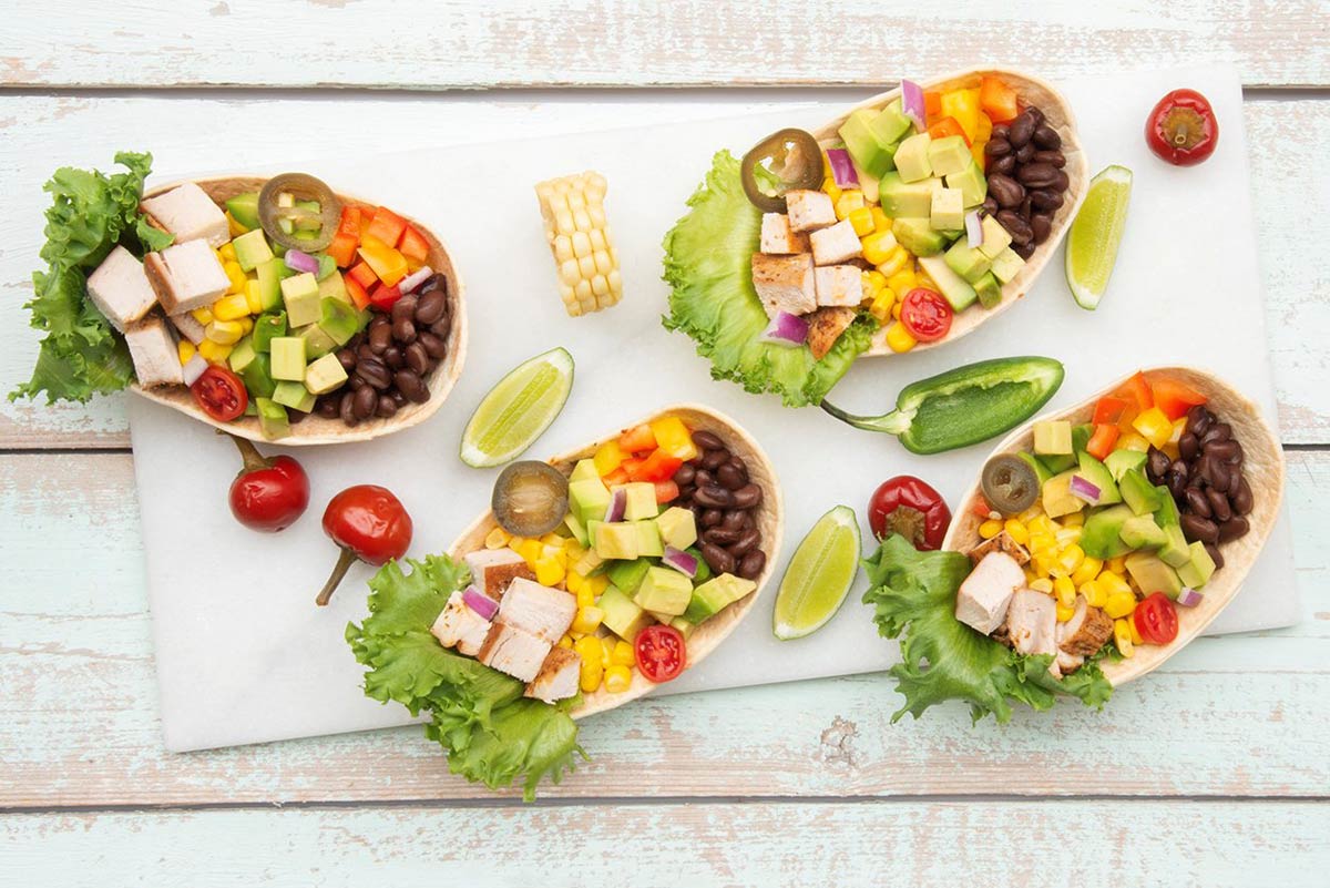 - מרפדים כל טאקו בעלה חסה, מניחים קוביות עוף, קוביות פלפל, קוביות אבוקדו, תירס, קוביות עוף, חצאי עגבניות שרי ובצל סגול.
