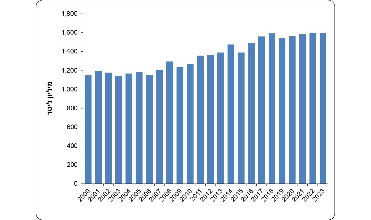 תרשים 1 - תפוקת חלב בקר, 2023-2000