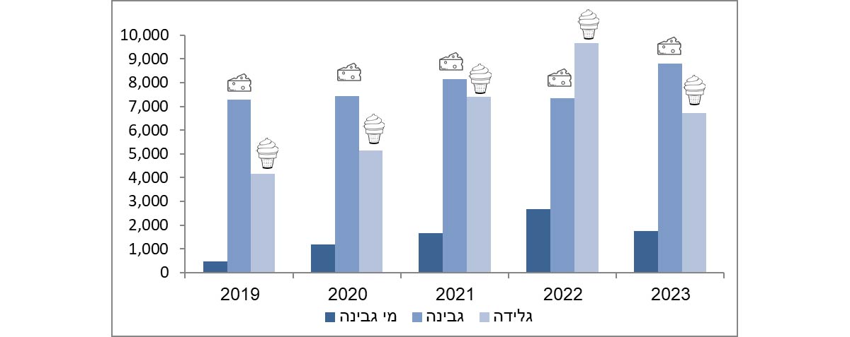 - תפוקת החלב הכוללת בשנת 2023 נאמדה ב-1,635 מיליון ליטר, ירידה קלה של 0.5% לעומת שנת 2022.