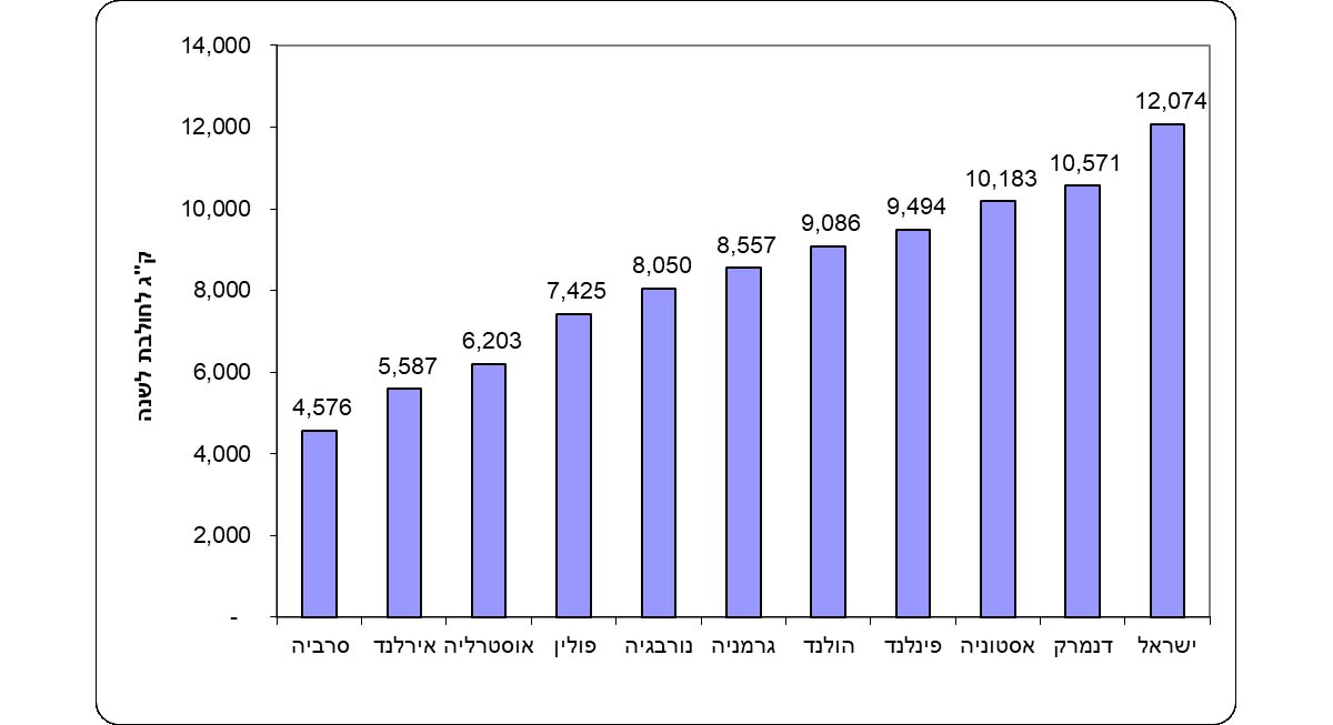 תרשים 2 - תנובת החלב לפרה חולבת - השוואה בין-לאומית, 2022