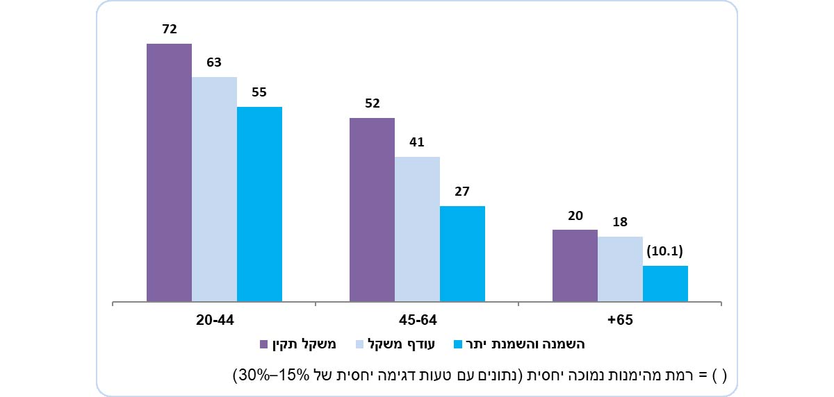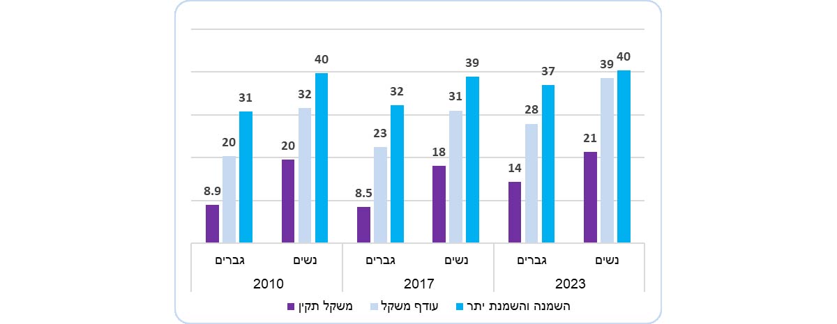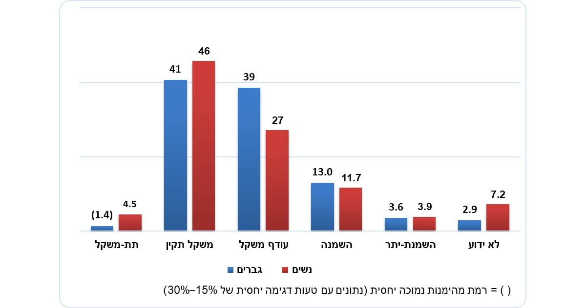 גברים נמצאים במצב של עודף משקל יותר מנשים בכל קבוצות הגיל (39% לעומת 27%, בהתאמה). 3.0% נמצאים במצב של תת-משקל: 8.0% מבני 24-20; 7.1% מבני 29-20, 11% מהנשים בגילים אלו.