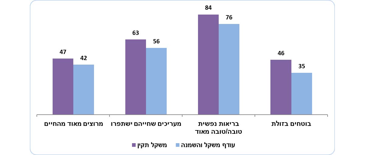 46% סבורים שאפשר לבטוח במרבית האנשים לעומת 35% מהאנשים במצב של עודף משקל והשמנה. 50% סבורים שיש להיזהר מאנשים לעומת 60% מאלה שבמצב של עודף משקל והשמנה.