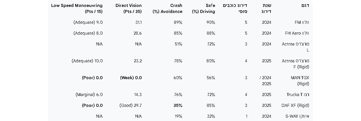 ציונים נמוכים: דגם מאן TGX קיבל 0 נקודות בראייה ישירה. הדבר מלמד על ליקוי תכנוני מהותי שמחייב את הנהג להסתמך במידה רבה על ראייה עקיפה (מצלמות ומראות), ומקטין את הבטיחות של משתמשי הדרך הפגיעים.