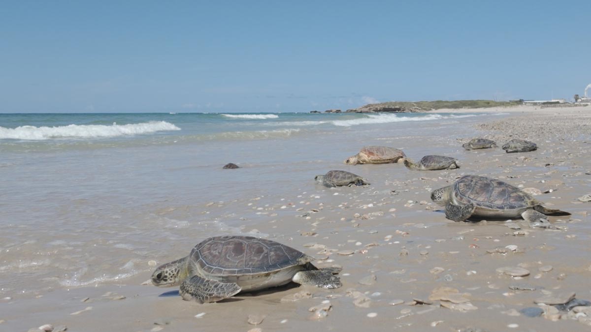 בסיוע צוות ומתנדבי המרכז שוחררו שלושה מקבצי צבי ים בכל מיני גילים. תחילה שוחררו שישה צבי ים חומים קטנים - מסי, זאב, יהושע, מקלוק, זיפזיף, טום טום - ושני צבי ים ירוקים: אירנה ושקדן. משקלם של הצבים נע בין 175 ל־880 גרם והם סבלו מפציעות בגלל הסתבכות בשקי פלסטיק, חוטי דיג ופצעי נשיכה. צבי ים קטנים משוחררים בדרך כלל בלב ים כדי לסייע להם לשוב אל בית הגידול הטבעי שלהם, אך בשל המצב הביטחוני, לא התאפשר לבצע זאת.
