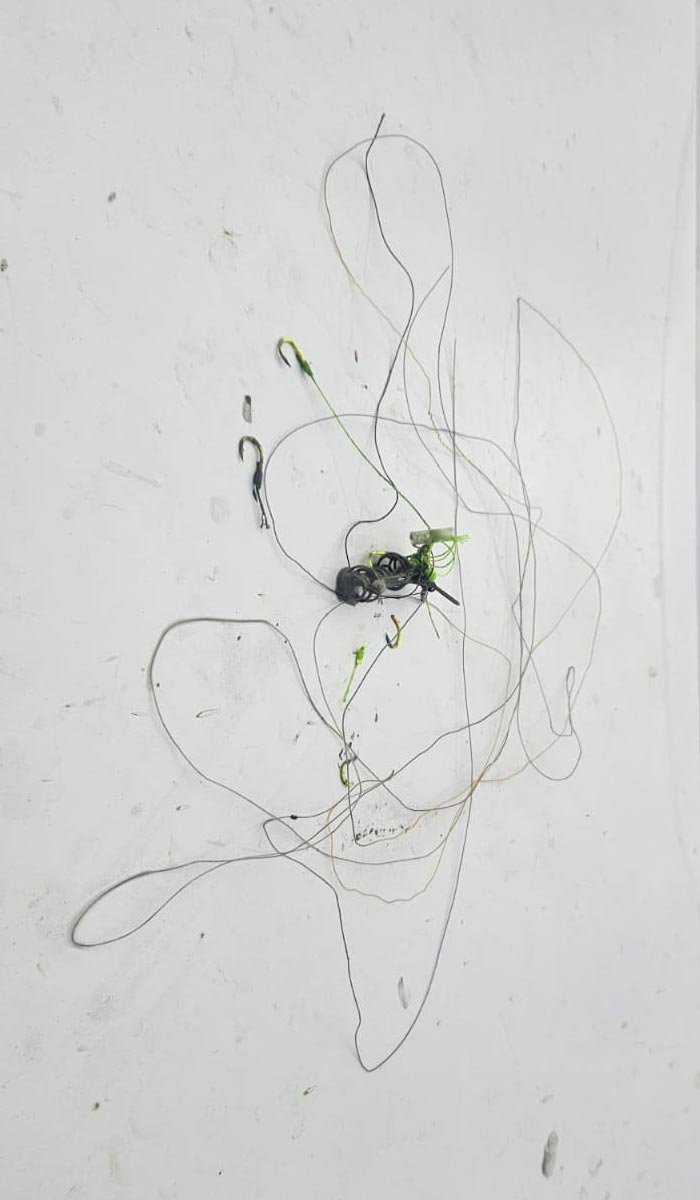 הפקח איליה בסקין ביציאה מבריכות הדגים | חלק מציוד דיג שהפלמינגו הסתבך בו. צילום: שי קבסה, רשות הטבע והגנים