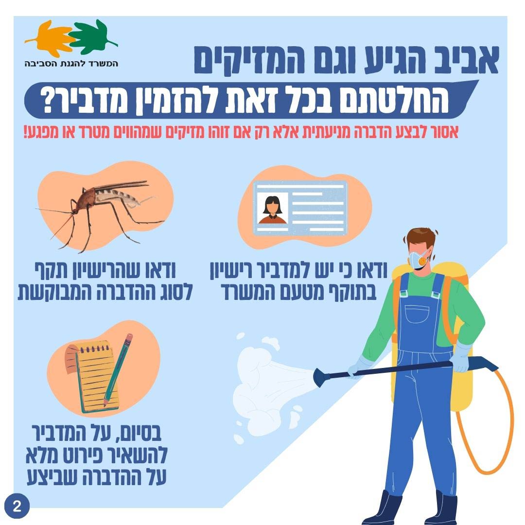 ד"ר שי רייכר, מנהל אגף מזיקים והדברה במשרד להגנת הסביבה: "האביב מתאפיין בתנאי מזג אוויר אידיאליים להתפתחות מזיקים תברואיים, אשר עלולים להיות מטרד לאדם. פעולות פשוטות עשויות לצמצם במידה רבה את מטרדי המזיקים ולהפחית את הצורך להשתמש בתכשירי הדברה. הדברה תברואית אינה מותרת על פי חוק לצורכי מניעה, ומשמשת אך ורק לצמצום נוכחותם של מזיקים תברואיים קיימים. גם זאת רק אם וכאשר הם מופיעים באופן שאינו ניתן לשליטה ללא שימוש בכימיקלים. אם צריך להשתמש בתכשירי הדברה, יש לקרוא בקפידה את ההוראות המופיעות על גבי התווית ולפעול אך ורק בהתאם למפורט בה."