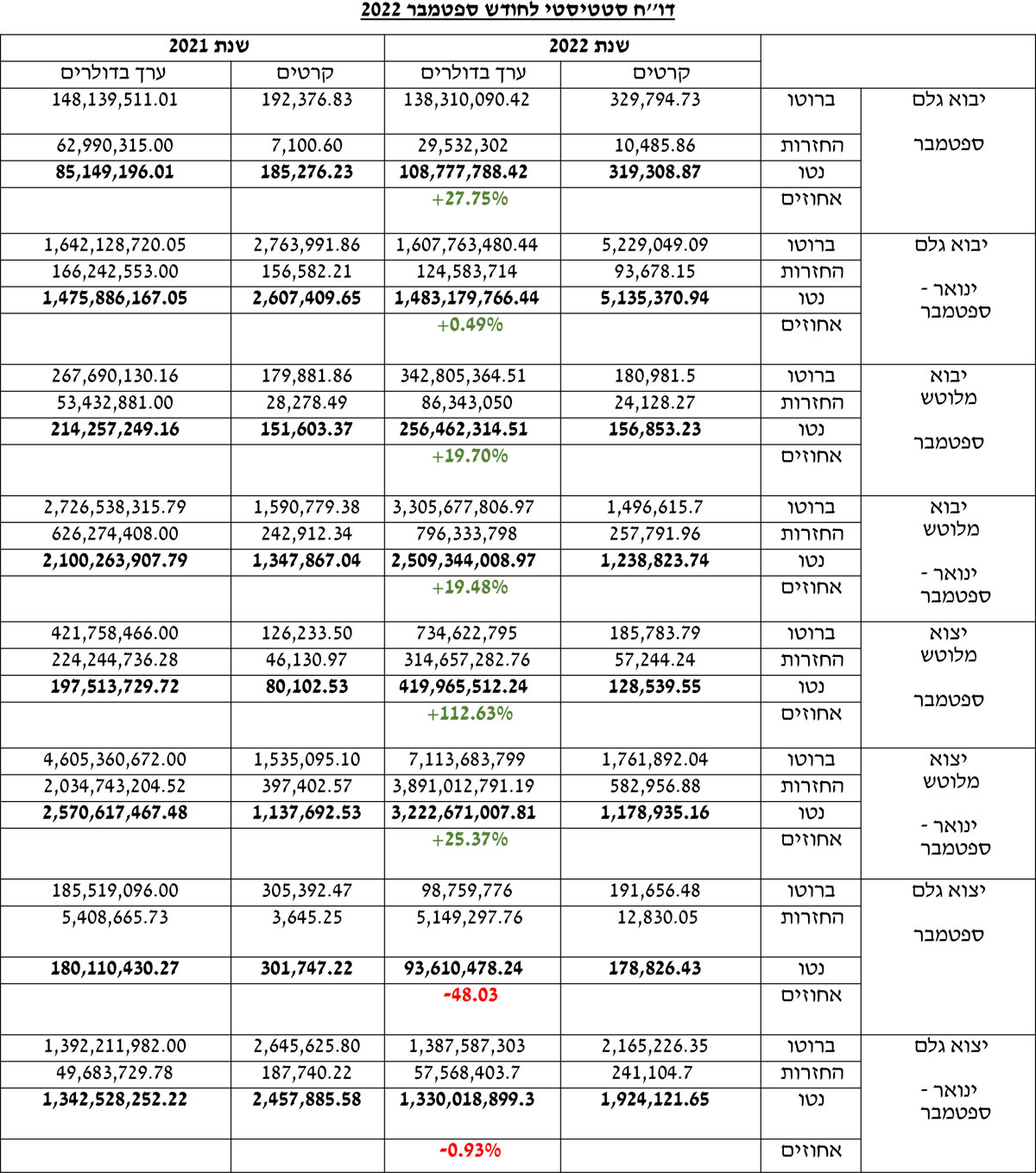ייבוא היהלומים המלוטשים נטו בשלושת הרבעונים הראשונים של השנה היה 2.5 מיליארד דולרים, עלייה של כ-19% לעומת התקופה המקבילה בשנת 2021 (בחודש ספטמבר נרשמה עלייה של כ-20% לעומת ספטמבר אשתקד), ובייצוא היהלומים המלוטשים נטו, שהיה 3.22 מיליארדי דולרים, נרשמה עלייה של כ-25% לעומת התקופה המקבילה בשנת 2021 (בחודש ספטמבר 2022 נרשמה עלייה חדה של כ-112% לעומת ספטמבר אשתקד).
