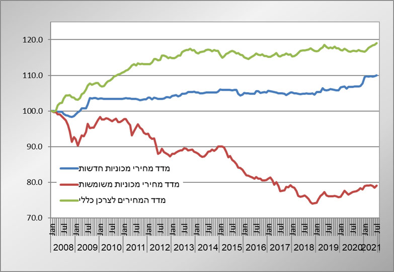 * משנת 2019 התהפכה המגמה, ובמחירי הרכב המשומש נרשמה עלייה של כחמש נקודות אחוז נכון לאמצע שנת 2021.