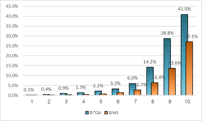 תרשים מס' 13: שיעור העובדים שמקבלים רכב צמוד מהמעביד לפי מגדר ועשירוני הכנסה חודשית