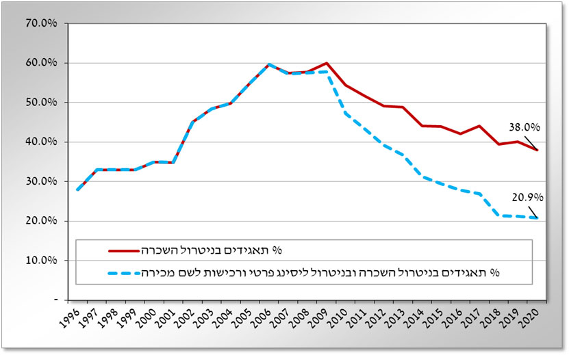 תרשים מס' 12: אחוז רכישות רכב חדש בידי תאגידים (ציי רכב) בשנים 2020-1996