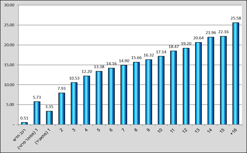 חושב גם הגיל הממוצע של כלי רכב לפי מספר העברות הידיים לפני המכירה. בעבור רכב שנמכר מיד ראשונה נעשה פיצול לפי סוג המוכר - פרטי או תאגיד, מכיוון שתאגידים נוטים למכור רכב בגיל צעיר למדי. חלק מכלי הרכב נרכשים מראש בידי חברות ליסינג למטרת מכירה, וחלק נמכרים לאחר תקופת שימוש אינטנסיבי (5-3 שנים) בציי רכב. יש לכך ביטוי בנתונים: רכב יד ראשונה בבעלות פרטית נמכר אחרי שהיה 5.73 שנים בממוצע אצל הבעלים הראשון, ולעומתו רכב בבעלות תאגיד נמכר לאחר 3.35 שנים בממוצע.